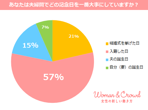 夫婦間で一番大事にしている記念日として、約60%が入籍した日を挙げましたが、15%の女性は「夫の誕生日」と回答しました。
