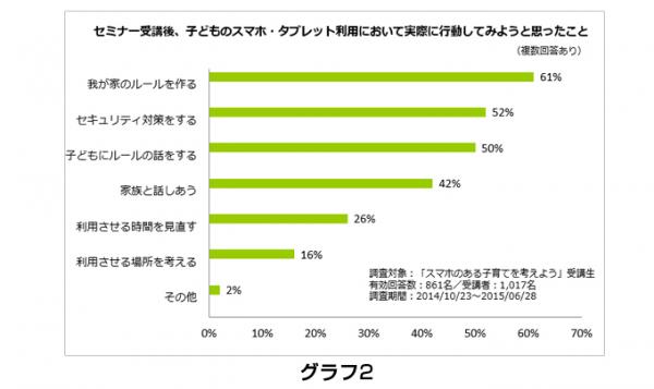 セミナー受講前の意識調査(グラフ1)では、スマホ利用に対する保護者の様々な不安が浮き彫りになりましたが、受講後のアンケート(グラフ2)では、「子どものスマホ・タブレット利用において実際に行動してみようと思ったこと」として、「我が家のルールを作る(61%)」「セキュリティ対策をする(52%)」「子どもにルールの話をする(50%)」「家族と話し合う(42%)」などが挙げられ、家庭でのルールづくりやセキュリティ対策に対する意識の高まりと、行動をするきっかけが生まれていることがわかりました。