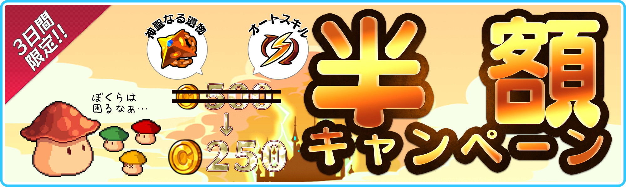 期間中、冒険出発時に購入できる「神聖なる遺物」と「オートスキル」がそれぞれ半額となります。