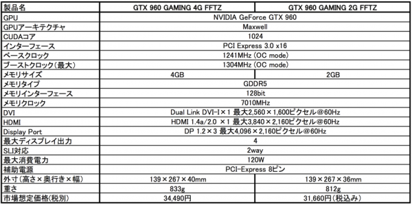 なお、「GTX 960 GAMING 4G FFTZ」および「GTX 960 GAMING 2G FFTZ」の仕様は下記のとおりです。