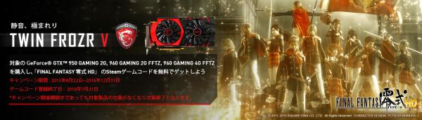 2015年9月17日 -Micro-Star International Co. Ltd., 台湾・新北市- Micro- Star International Co. Ltd.(MSI)は、ご好評いただいております、スクウェア・エニックスのファイナルファンタジーシリーズ最新作「FINAL FANTASY 零式 HD」 PC版(Steam)のゲームコードを無料でプレゼントするキャンペーンを拡大し、新たに本キャンペーン特別モデルとしてNVIDIAのGeForce GTX 960搭載グラフィックスカード「GTX 960 GAMING 4G FFTZ」および「GTX 960 GAMING 2G FFTZ」を9月18日に市場投入いたします。これらの製品をご購入いただいた方にも、もれなくゲームコードをプレゼントいたします。対象期間は、2015年12月31日まで、対象製品がなくなり次第終了とさせていただきます。また、ゲームコードの最終登録日は2016年7月31日です。なお、両製品の市場想定価格(税別)は、それぞれ34,490円、31,660円の見込みです。