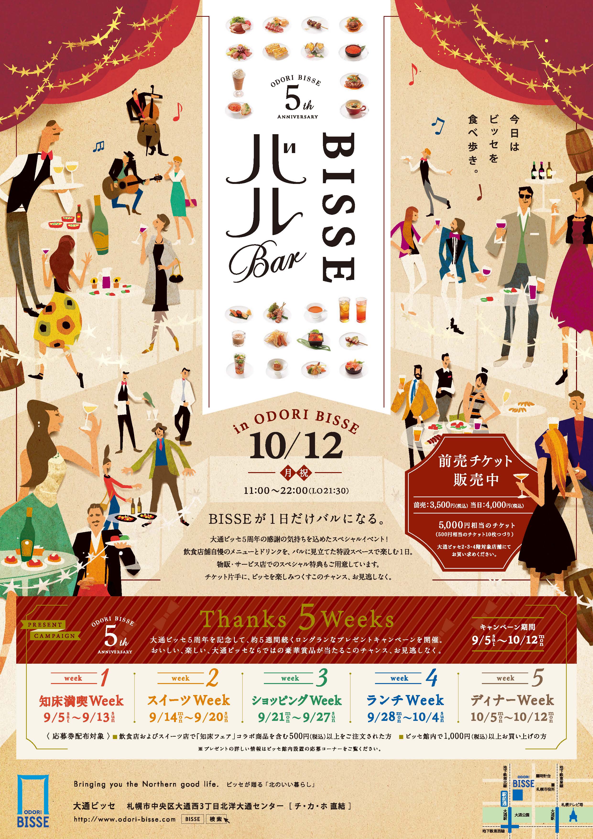 北海道・札幌の大通ビッセでは、大通ビッセ5周年のスペシャルイベントをより楽しんでいただくために、2015年9月14日(月)から「BISSEバル(10/12開催)」の前売チケット(3,500円)の発売を開始したところ、多くのお客さまから反響をいただいております。