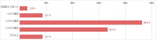 妊娠期間中に10キロ以上体重が増加したママさんは42%いらっしゃることが分かりました。