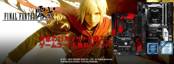 2015年9月18日 -Micro-Star International Co. Ltd., 台湾・新北市 / 東京ゲームショウ 2015 - Micro- Star International Co. Ltd.(MSI)は、9月17日~20日まで幕張メッセで開催されている「東京ゲームショウ2015」において、Intelの第6世代Coreプロセッサに対応したIntel Z170チップセットを搭載したマザーボード、「Z170A GAMINGシリーズ」をご購入の方を対象に、スクウェア・エニックスのファイナルファンタジーシリーズ最新作「FINAL FANTASY 零式 HD」 PC版(Steam)のゲームコードを無料でプレゼントするキャンペーンを9月19日より開始すると発表しました。
