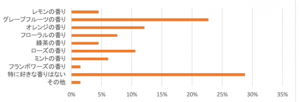 食器用洗剤の好きな香りはグレープフルーツの香りとお答えになられた方が一番多くみられました。また、特に好きな香りはないと回答された方のほうが多くいらっしゃることも明らかになりました。
