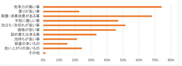 食器用洗剤に求める事トップ3は、「洗浄力が高い事」74.2%、「除菌・消臭効果がある事」68.2%、「泡立ち・泡切れが良い事」51.5%という結果になりました。この質問に関しても「香りが良い事」は、あまり求められていない事がわかります。