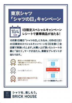 「BRICK HOUSE by Tokyo Shirts 」などの店舗ブランドで、高品質なシャツ専門店チェーンを全国200店舗展開する東京シャツ株式会社(東京都千代田区 代表取締役五十部 雅昭、以下「東京シャツ」)は、10月第1日曜日の「シャツの日」にちなみ、10月4日(日)1日限定のスペシャルキャンペーンを全店舗(EC除く)で実施致します。お買い上げ頂いたレシートの裏に「当たり」マークが出たら、素敵な特典やプレゼントが当たります。