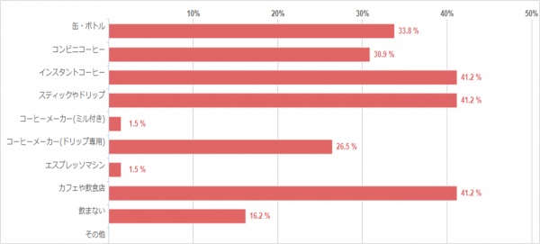 また、「コーヒーメーカー」「エスプレッソマシン」でコーヒーを飲んでいる方は合計で29.5%。先述の所有率は4割を超えていたことから、「所有しているけど今は使っていない」という方もいることが分かりました。