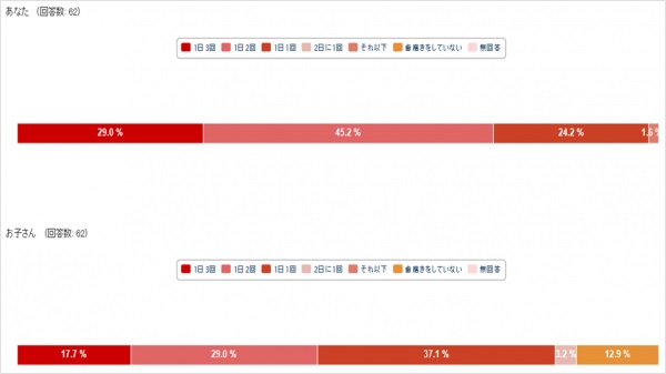 「1日3回」というママさんは29%、お子さんは17.7%。「1日2回」というママさんは45.2%、お子さんは29%。「1日1回」というママさんは24.2%、お子さんは37.1%。以上の結果になりました。