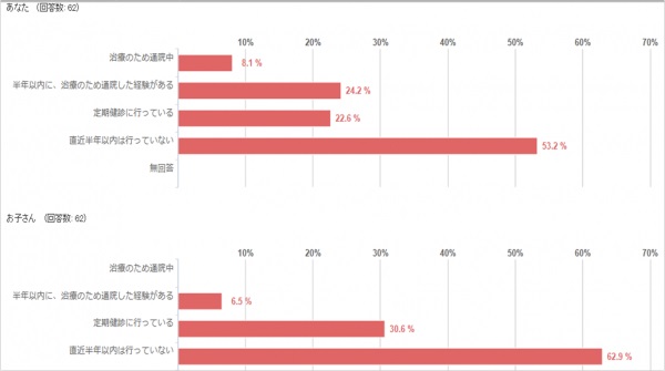 「定期健診に行っている」割合を見ると、ママさんは22.6%なのに対して、お子さんは30.6%という結果になりました。このことから、お子さんが小さいうちから予防歯科を行っているママさんが多いことが分かりました。