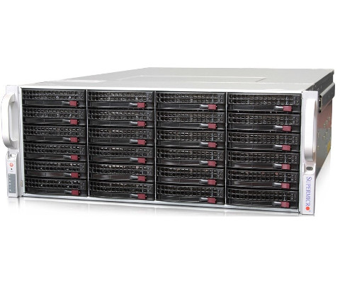 LGA-2011 v3 ソケット(ソケット R3)対応の Xeon E5-1600 v3 および Xeon E5-2600 v3 ファミリーCPU が搭載可能で、24 台の 3.5 インチ・ホットスワップ対応リム―バブルベイと、システムの連続運用を可能にする、ホットスワップ・リダンダント電源を備えた、4U システムです。Intel Hyper-Threading Technology のサポートにより、最大 18 コア 36スレッドの 64bit 並列演算処理に対応し(1)、Intel Turbo Boost Technology 2.0、AVX2 コマンドセットなどの最新技術のサポートと、最大 5GT/s の DMI2 リンク、2133MHz DDR4 メインメモリー、最大 45MB の LLC キャッシュなどの強力なハードウェアにより、アプリケーションのパフォーマンスを、従来のシステムとの比較で 20%から 70%向上します。シリコンレベルで CPU に内蔵された PCI-Express3.0 規格の I/O コントローラ には、8x レーン・バス 4本、8x レーン・バス 2本、4x レーン・バス 2本がシステム拡張バスとして接続されており、高速通信ボード、12/6Gbps SAS/SATA RAID コントローラ、GP-GPU などが増設できます。CPU直結の 288ピン DIMM ソケットには、256GB までの ECC Registered DIMM または 512GB までの ECC LR-DIMM が実装できます。
