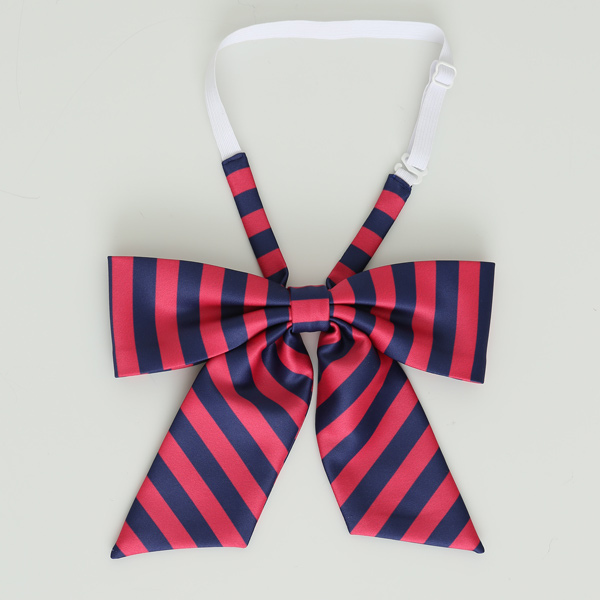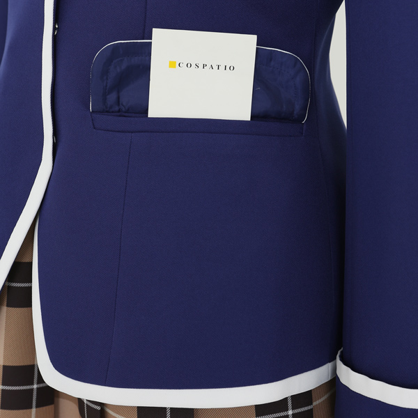 ジャケットのV字カットが入ったカフスやストライプ柄のリボンなど、国内縫製で丁寧に仕上げられた遠月学園の女子制服です。ぜひご確認ください。