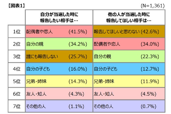 Q.もしもあなたが宝くじで高額当選(100万円以上~)したら、あなたは当選したことを周りの人に報告しますか?また、他の人が高額当選した場合、誰から報告してほしいですか?(図表1)