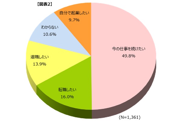 全体では「今の仕事を続けたい」(49.8%)が最も高く、「転職したい」(16.0%)、「自分で起業したい」(9.7%)を合わせると、75.5%の人が仕事を継続する意向を示しています。