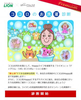 ディグラム・ラボ株式会社(本社:東京都港区、代表取締役:木原誠太郎)は、ライオン株式会社(本社:東京都墨田区、代表取締役社長:濱 逸夫)との共同開発により、心理状態を分析する診断サービス「トップ ココロのお洗濯診断」を2015年9月28日(月)より開始いたします。また、今回の診断コンテンツを制作するにあたり調査した、日本の女性5000人に対するアンケートデータ(2015年7月実施)より、「洗濯にまつわる言動」が明らかになりました。いくつかの調査結果が上がってきましたので、その結果をお知らせいたします。