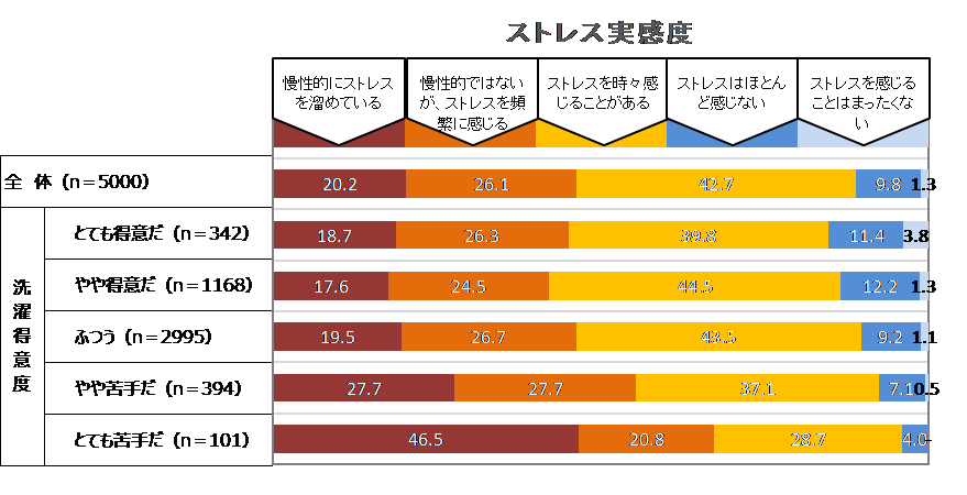 精神的に落ち込んだ時ほど、部屋の掃除や洗濯が滞りがちになると言われていますが、この結果から、「洗濯が得意」とする人ほど、ストレスを溜めにくい傾向があり、一方で「洗濯が苦手」とする人ほど、ストレスを溜めやすい傾向があるようです。
