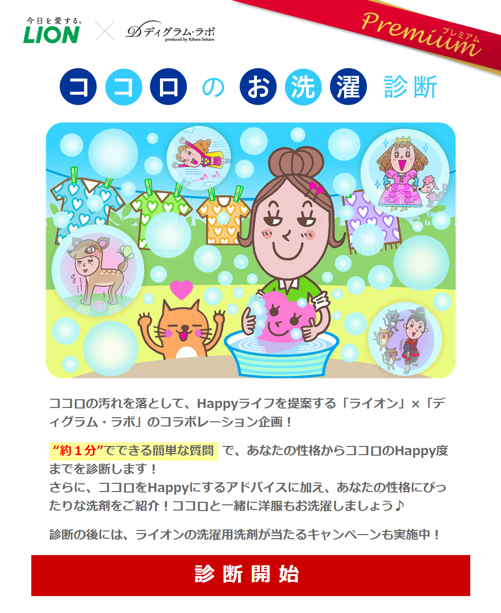 同診断では、「ディグラム診断」のメソッドと5,000人のアンケートデータに基づき、20個の質問からユーザーの心理状態を分析。それぞれの性格別に、「性格分析」や「行動アドバイス」「オススメの洗剤」などを紹介していきます。