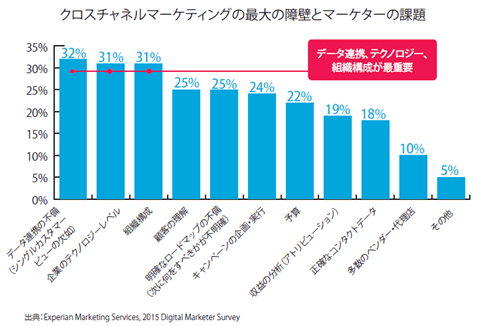 複数のチャネルやデバイスを自由自在に使いこなす現在の消費者に対して、マーケターは、チャネルやデバイスを超え、あらゆるタッチポイントにおいて消費者一人ひとりに最適化され、ブランドとして一貫した文脈が維持されたメッセージを提供する必要があります。本調査では、このようなクロスチャネルマーケティングの実現を妨げる大きな要因として、散在する顧客データの連携ができていないために顧客像の明確化ができない点や、チャネルや商品で区切られた縦割り「サイロ型」組織構成、適切なテクノロジーを持たないという点が挙げられました。