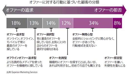 マーケターは、単に顧客が誰であるかを把握していればいいわけではなく、顧客が何を好み、何を求めているか理解する必要があります。例えば、小売業者の多くは低価格こそ顧客の購買動機になると考え、割引や特別オファーをすべての顧客に提案していますが、私たちの調査によれば、こうしたオファーに対する顧客の行動は様々です。オファーに対する消費者行動の視点から見ると、顧客は「オファー追求型」から「オファー拒否型」まで6種類に分類することができます。個々の顧客セグメントの購買行動や動機、ニーズを明らかにすることで、セグメントごとに適切なオファーや割引戦略を構築することが可能となるでしょう。