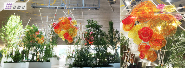 プラスチック成形メーカーの本多プラスが手がけるブランド『ame』が、『第32回全国都市緑化あいちフェア』会場内のディスプレイを行いました。花をモチーフにした壮大なオブジェは、リサイクルプラスチックを使用し、全て職人の手により作られています。プラスチックならではの透明感と軽やかさを持ったこの作品は、『花』をオレンジやピンク、赤などの鮮やかな色彩で表現し、植物の溢れる生命力の強さ、美しさをご来場者に喚起させるものになっております。