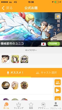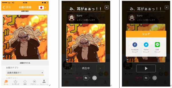 「誰でも声の人気者になれる!」をコンセプトに写真やイラストに一言録音できる機能を追加致しました。お題となるイラストや写真は誰でも投稿でき、お題投稿者と録音者で楽しくコミュニケーションできます。またTwitterやFacebook、LINEなどのSNSで動画としてシェアすることができ、友達同士でアフレコを楽しむことが可能です。
