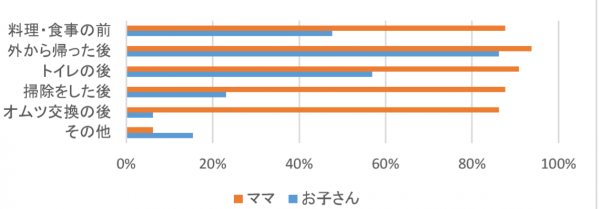 ほとんどのママさんは、毎日家事・育児の合間に手を洗っているという事が判明しました。また、「外から帰ってきた後」に手洗いをされているお子さんが最も多く、少数ですが、「掃除をした後」や「オムツ交換の後」にも手洗いをしている事から、ママのお手伝いをしているお子さんもいる事も分かりました。