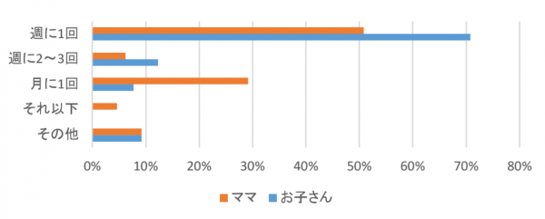 爪を切る間隔は週に1回と回答されたママさんが50.8%、お子さんは70.8%いらっしゃいました。また、月に1回以下と回答されたママさんは4.6%いらっしゃいましたが、お子さんの爪は最低でも月に1回は切られているようでした。