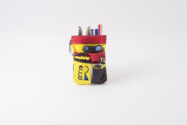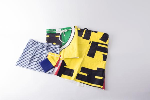 - 学生たちが横断幕をリサイクルし制作したアイテム工具入れ、エプロン (上・画像)-