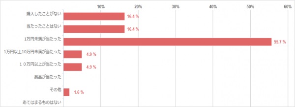 「1万円未満が当たった」という経験がある方が最も多く、55.7%でした。また、それ以上当たった経験がある方は9.8%いらっしゃいました。小額でも当選経験のある方が多い結果になりました。