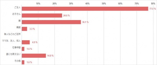 「ご主人」に教えるという方は77%で最も多かったですが、23%の方はご主人には教えたくないということが分かりました。