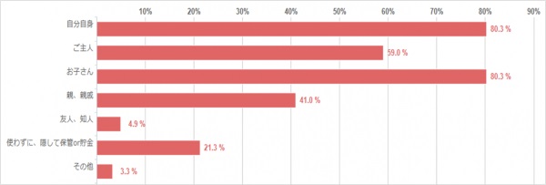 「自分自身」と「お子さん」が同率の80.3%でした。「ご主人」のために使いたいという方は59%で、比重が低い結果になりました。