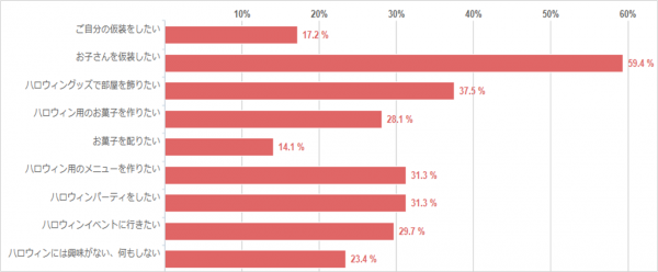その結果、「お子さんを仮装したい」というママさんが最も多く、パーティを開いたりイベントに行ったりしたいというママさんも多くいらっしゃいました。結果の詳細をご覧ください。