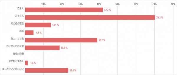 「お子さん」と楽しみたいというママさんが最も多く、70.3%でした。お子さんを仮装したり、お子さんが喜ぶハロウィンメニューを作ってあげたりして楽しみたい方が多いようです。