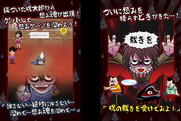 呪太郎を操作して「怨み魂(うらみだま)」を集めゲージをいっぱいにすると、呪太郎の様々な「呪いの裁き」を見ることができます。「怨み魂」は、ゲームをプレイしていない間にも、経過した時間に応じて生まれていくので、忙しい方にもお楽しみいただけます。