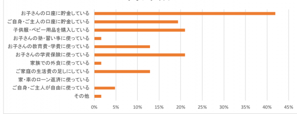 「児童手当」というだけあって、「お子さんの口座に貯金している」方は41.9%いらっしゃいました。お子さんの学資保険に使っている方も多く、将来のお子さんのためにとお考えのママさんが多くいらっしゃるようでした。