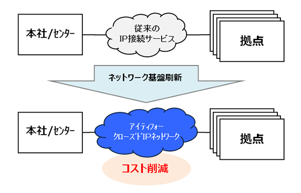 IP接続サービスを「アイティフォークローズドIPネットワーク」へリプレース、アクセス回線も同時に変更することにより、通信コストを年間で約1千万円削減します。