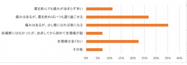 上記の結果同様、生理痛にも個人差があり、「生理痛は全くない」22.5%という方から「薬を飲んでも痛みが治まらず辛いといった方は11.3%」いらっしゃる事が明らかになりました。生理痛のあるママさんは、痛みを少しでも抑えるために、生理痛対策を行い、毎日の家事・育児を頑張っていらっしゃるようです。