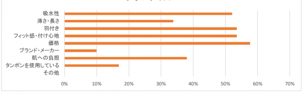 生理用ナプキンは「価格」を重視するという方は5割以上いらっしゃる事が判明しました。また、「吸水性」「羽付き」「フィット感・付け心地」なども5割以上いらっしゃいました。まずは価格を見てから、ご自身に合ったものを購入されている事が分かります。