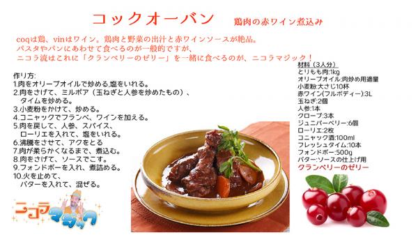 日本人の味覚にあわせてアレンジした、コックオーバン(赤ワインの鶏肉煮込み)。