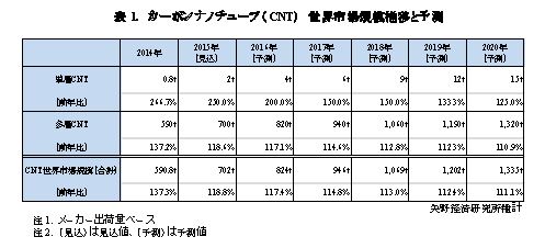 ◆ 2014年のカーボンナノチューブ(CNT)世界市場規模は590.8t、前年比137.3%と大きく伸長