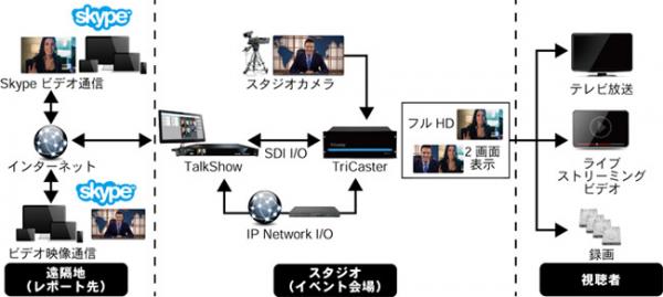 NewTek社のTalkShowは、ライブのSkypeビデオ通話をHDフルフレームで放送に乗せることができる最も簡単で、最も高品質な制作ソリューションです。コンパクトな1RUのシステムには、Microsoft社のSkype TXが内蔵されており、SDI入出力を利用して直接スイッチャーと接続することができるため、プロ フェッショナルな制作ワークフローを提供します。TalkShowによって、高品質なSkype通話の制御を調整室で行うことができるだけでなく、中継現場に多くの機材を持ち込む必要もなくなります。