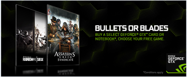 2015年10月7日-Micro-Star International Co. Ltd., 台湾・新北市- ゲーミングハードウェアで市場をリードするMicro- Star International Co. Ltd.(MSI)は、NVIDIAのGeForce GTX 980Ti / 980 / 970搭載グラフィックスカードの購入者に、ユービーアイソフトが12月1日に発売予定の「Tom Clancy’s Rainbow Six Siege」(レインボーシックス シージ)か、11月19日発売予定の「Assassin’s Creed Syndicate」(アサシン クリード シンジケート)のPC版いずれか一方に引き換え可能なゲームコードを無料でプレゼントする「Bullets or Blades」(弾丸か剣か)キャンペーンを実施いたします。キャンペーン期間は9月6日から12月14日までで、限定数に達し次第終了となります。本キャンペーンのゲームコードの有効期限は2015年12月31日です。