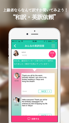 『英語相談コミュニティ!ぺらりんご』は、英語学習者の”孤独”と”迷子”を解決するために生まれたソーシャルコミュニティです。(1)何でも質問できる「相談」、(2)無料で翻訳を頼める「英訳和訳依頼」、(3)仲間とグループを作れる「クラブ」、(4)チェックリストで英語力を測る「英体験」、これらの機能を通してあなたの英語学習をみんなで支えます。