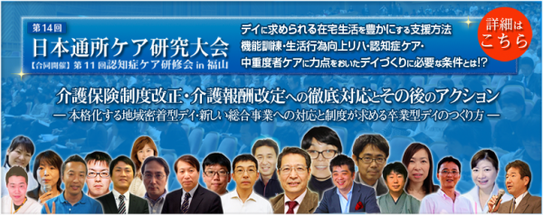 大会テーマを「介護保険制度改正・介護報酬改定への徹底対応とその後のアクション~本格化する地域密着型デイ・新しい総合事業への対応と制度が求める卒業型デイのつくり方~」とし、地域・利用者にもっと頼られ必要とされる具体策を学んでいただきます。