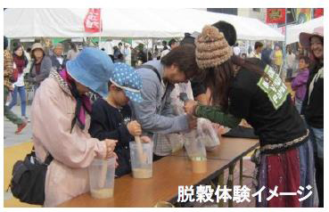机ひとつでできる「お米の脱穀体験」。農業女子メンバーがお子さまにもやさしく指導します。