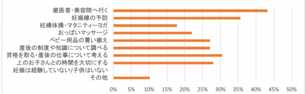 妊娠を経験されたママさん達は、「歯医者・美容院へ行く」(43.2%)という事を妊娠中にしておくべきだったと、お答えになられました。また、「資格を取る・産後の仕事について考える」というママさんは30.5%いらっしゃり、産後は、家事や育児で大変・子供がいるとなかなか外で働けないため、妊娠しているうちに産後のお仕事の事も考えておくべきだったと言う方もいる様でした。