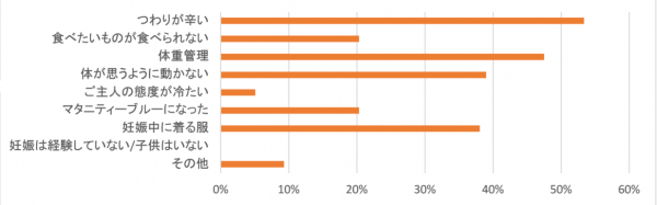 初めて経験する妊娠は、困る事や辛い事がとても多いですが、5割以上のママさんは「つわりが辛かった」と回答されました。お腹が大きくなるにつれ、体が思うように動かなかったり、体重管理なども、妊婦さんにとっては困る事・辛かった事の一つだと言う事が分かりました。また、妊娠中に「マタニティーブルーになった」という方が20.3%いる事も明らかになりました。