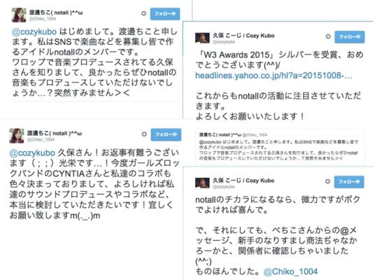今回、notallのメンバー、「渡邊ちこ」がtwitter上で「久保こーじ」さんに、notallの楽曲制作へ参加を呼びかけると、「久保こーじ」さんに参加承認のコメントを頂きました。