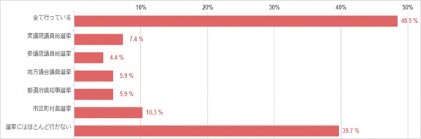 「全て行っている」というママさんは48.5%いらっしゃり、半数近くが全選挙に参加していることがわかりました。