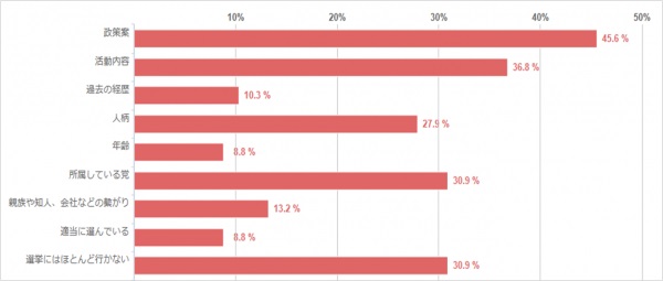 最も重視されているのが、45.6%の方が選択していた「政策案」でした。やはり、「この人は何をしてくれるのか」「この人が当選すれば、どのような良いことがあるのか」ということが基準になっているようです。